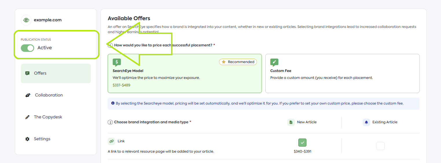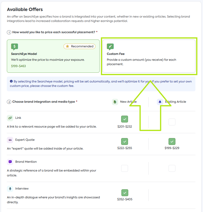Custom Fee Model: You set the minimum amount you want to receive for each Publication Offer.
