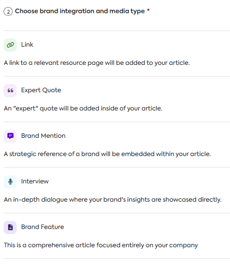 Brand Integration Type (e.g., Link, Expert Quote, Brand Mention, Interview, Press Release, or Brand Feature)