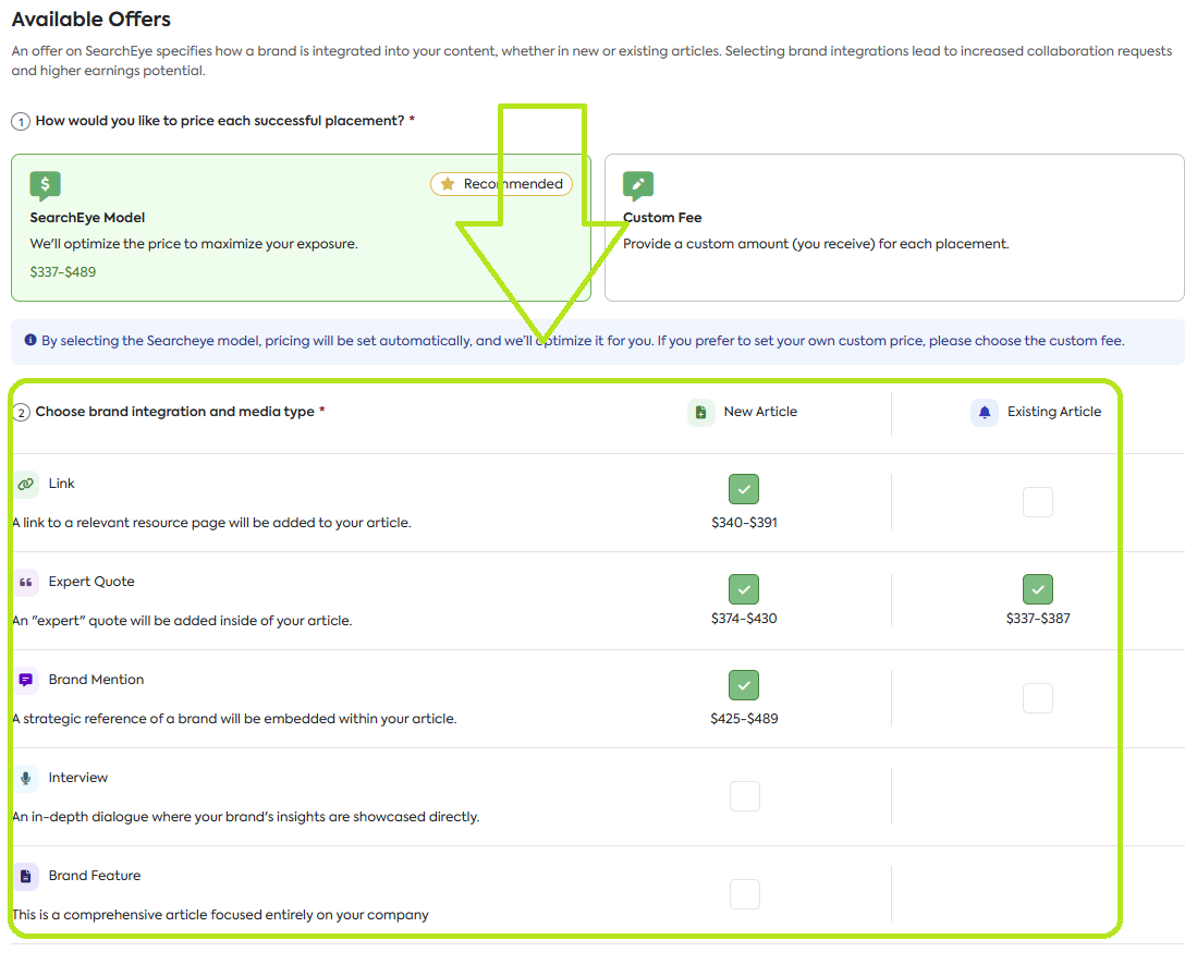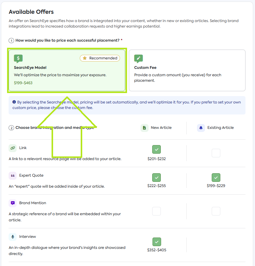 SearchEye Model [Recommended]: We'll automatically price your offer to optimize for revenue. Pricing is adjusted in real-time for fair value, ensuring you are earning the right number of credits for each Publication Offer. We take into consideration:
