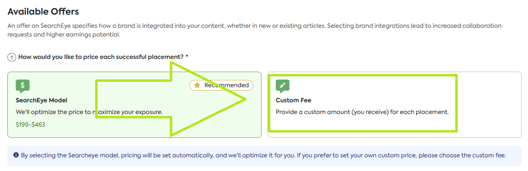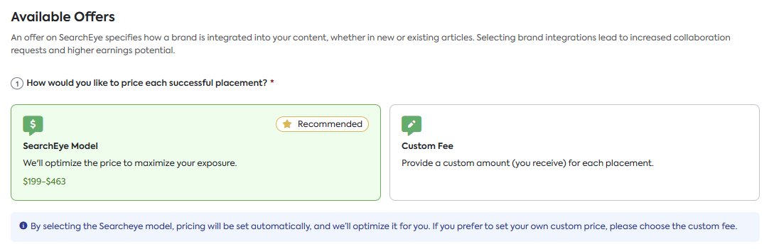 If you’re new to SearchEye or want to maximize collaboration requests, the SearchEye Pricing Model is recommended.