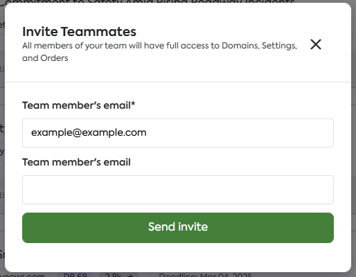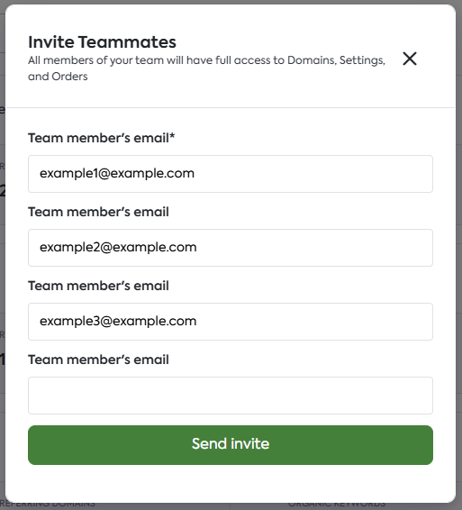 Note: Every time you enter a team member’s email address the pop-up will automatically create a space for you to enter another email address. This allows you to send multiple invites at once.