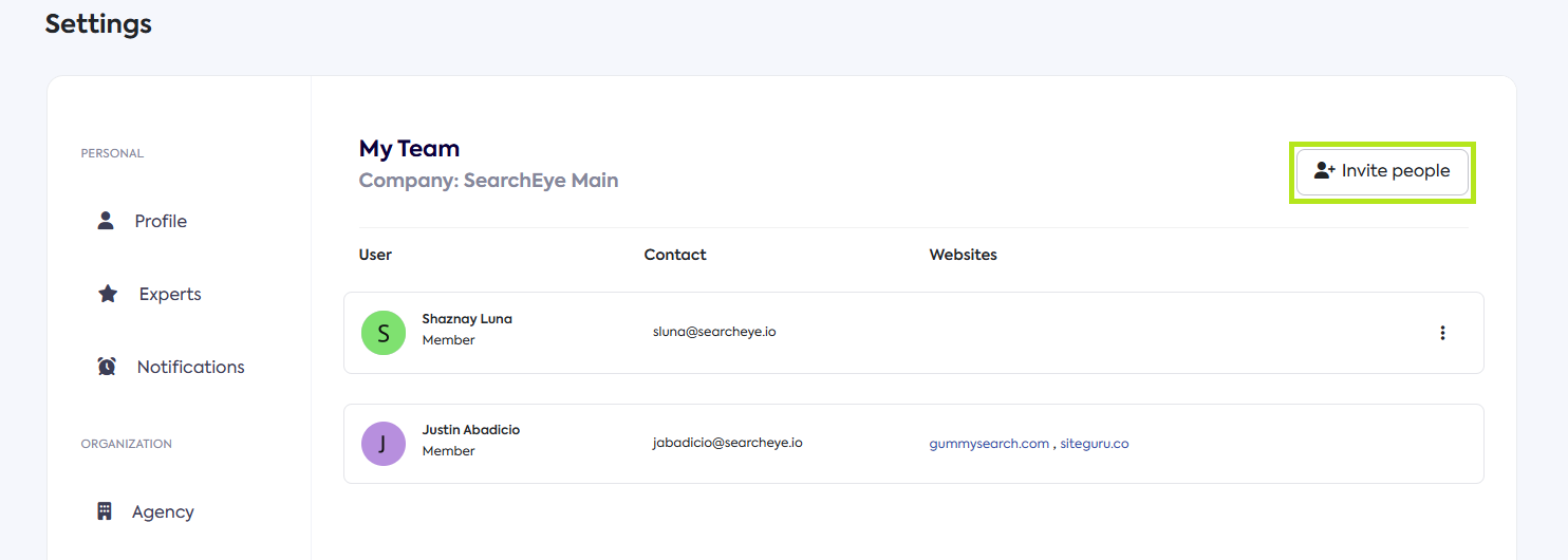 There are two ways to Invite People on the SearchEye platform, which are either directly from your Dashboard or your Settings.