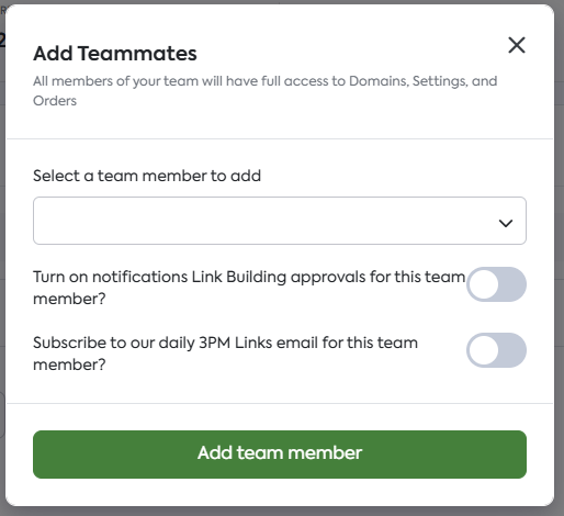 Yes! When adding a team member to a website, you can choose which notifications they receive—such as Link Building Approvals—to ensure proper delegation.