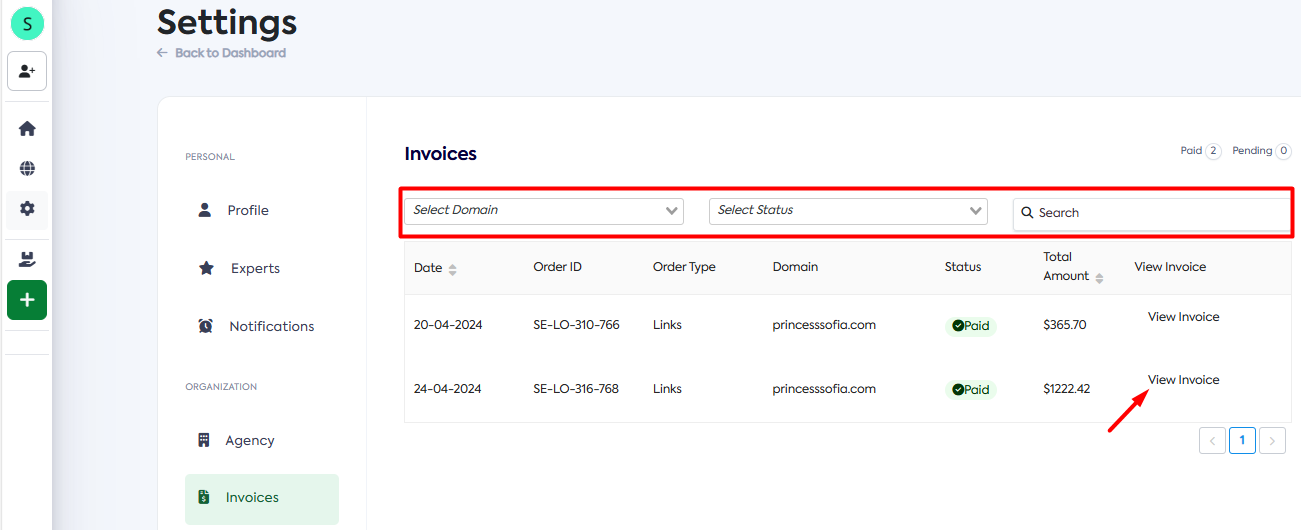 To view all your invoices in SearchEye, simply navigate to the Settings section and select “Invoices.” There, you can easily filter invoices by domain or status, or use your order ID to search for specific invoices.
