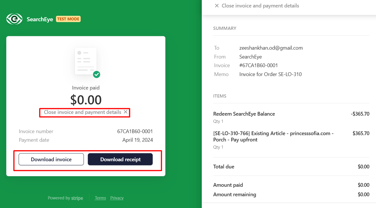 You can also download your invoice or receipt by clicking on the respective download options.