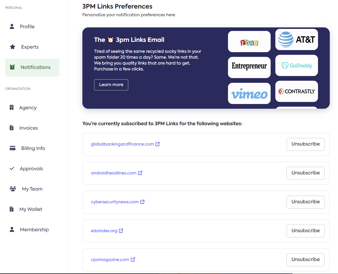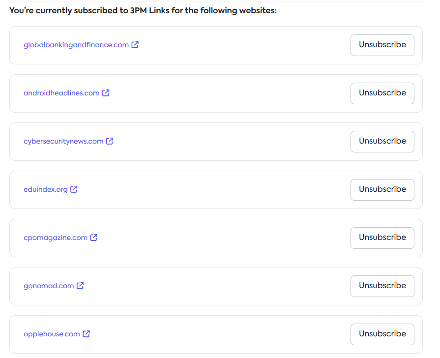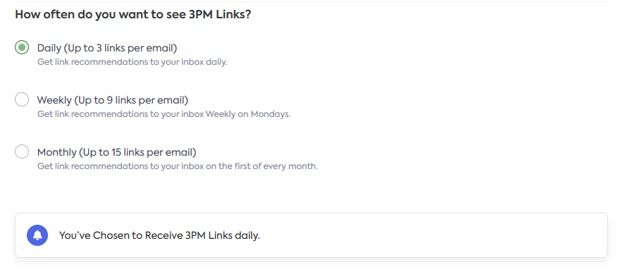 You will then be directed to the 3PM Links Preferences page where you can manage your subscriptions and set the frequency of receiving said links.