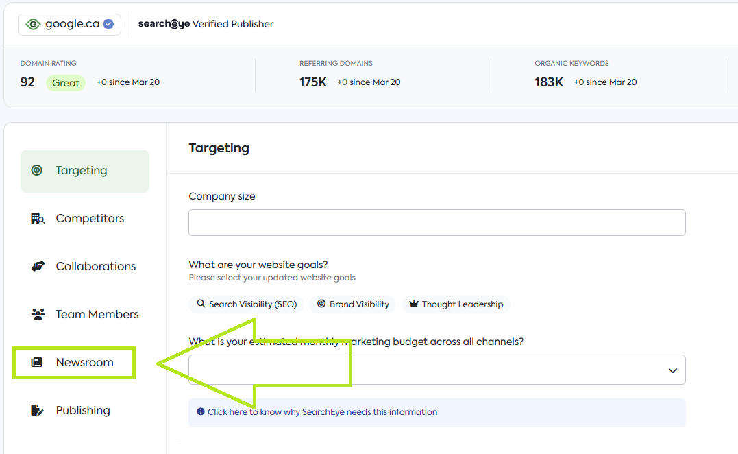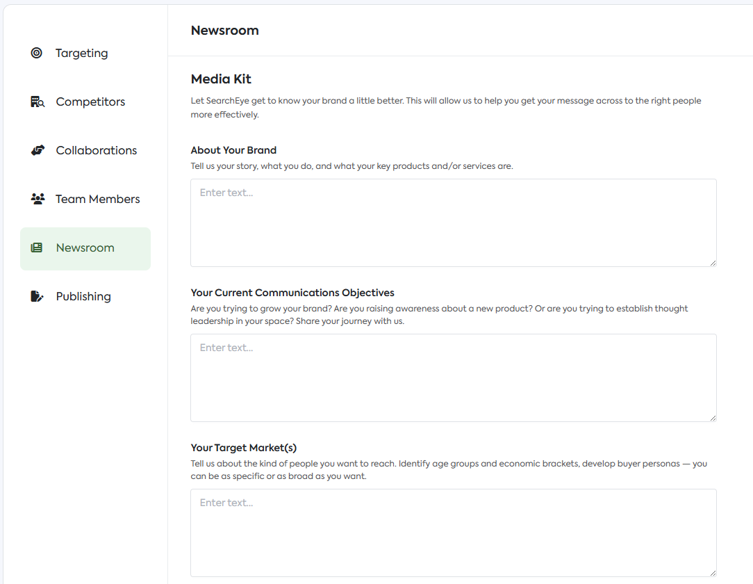 The Media Kit in SearchEye’s Newsroom is designed to comprehensively understand your brand. This information is pivotal for crafting tailored pitches that align perfectly with both your brand goals and publisher editorial guidelines.