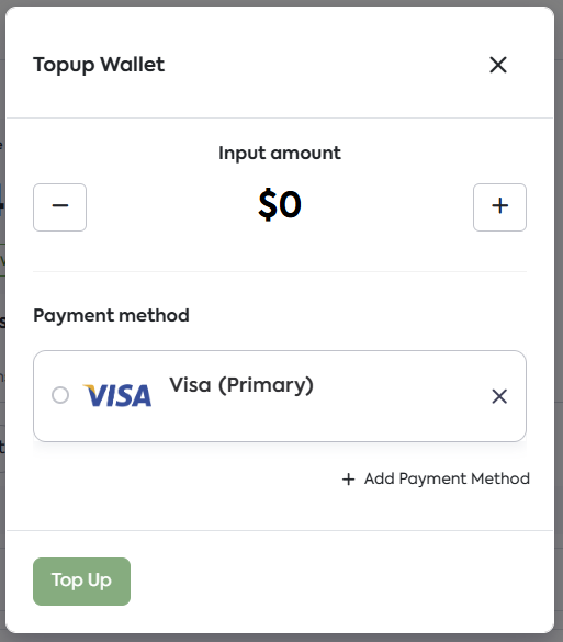 On the Topup Wallet pop-up, simply input the amount of credits you wish to purchase and select your payment method.