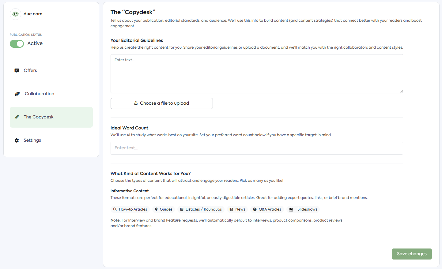 By providing detailed content preferences upfront, publishers receive better-aligned pitches, reducing editing time and improving content quality.
