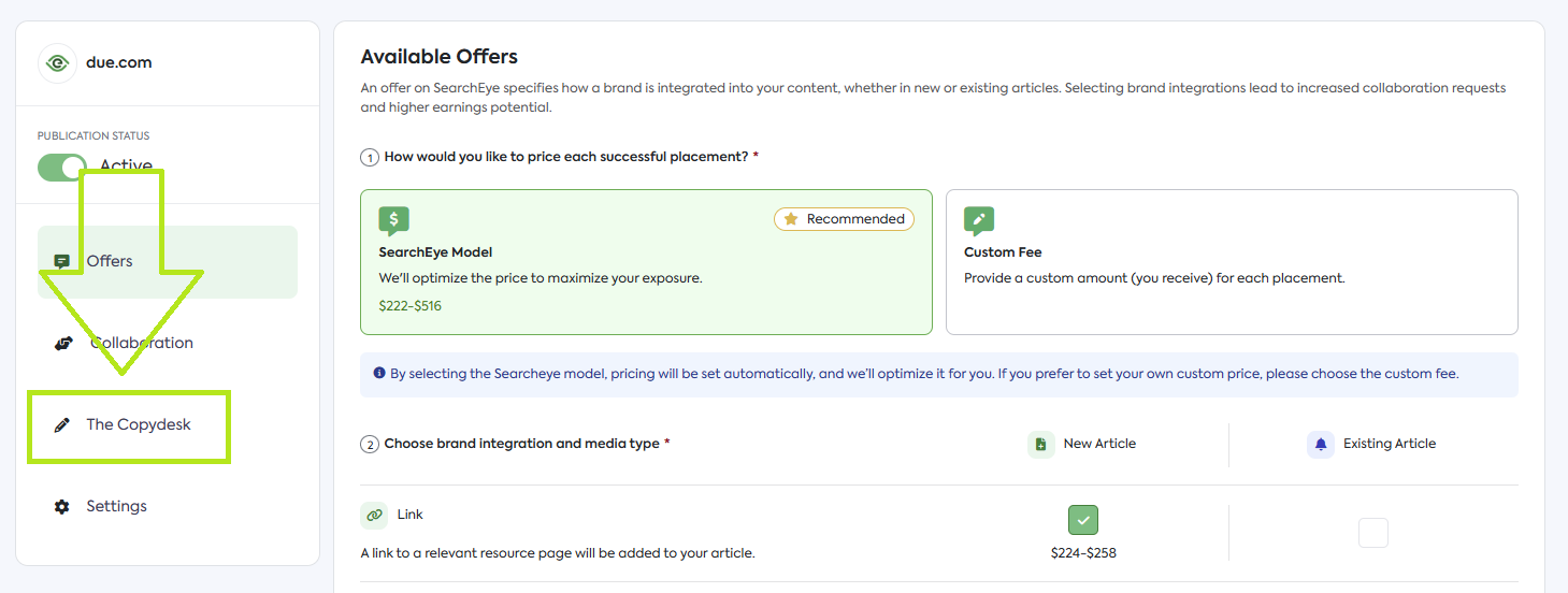 The Copydesk feature within SearchEye provides a platform for publishers to outline their specific needs and preferences, ensuring that the pitches received from brands are well-aligned with their publication’s objectives.