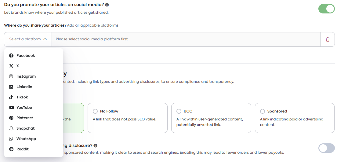 When enabled, this highlights to brands the social media platforms where your articles are shared. You can add all relevant platforms and include direct links to your profiles for greater visibility.