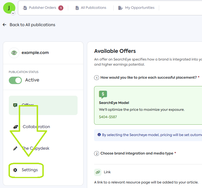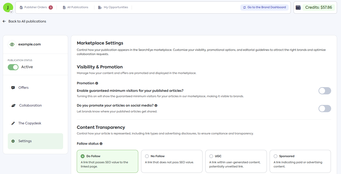 Easily update your Publication Marketplace Settings on SearchEye, including visibility & promotion, content transparency, content distribution, and workflows and approvals. Customize your marketplace presence to attract the right brands.
