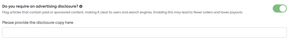 Use this option to flag articles that contain paid or sponsored content, ensuring full transparency with both users and search engines. You can provide your preferred disclosure text in the space below.