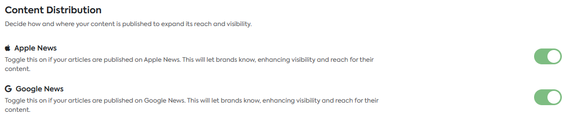 Google News - Enable this if your articles are distributed on Google News. This signals to brands that their content can gain additional visibility through Google’s news ecosystem.