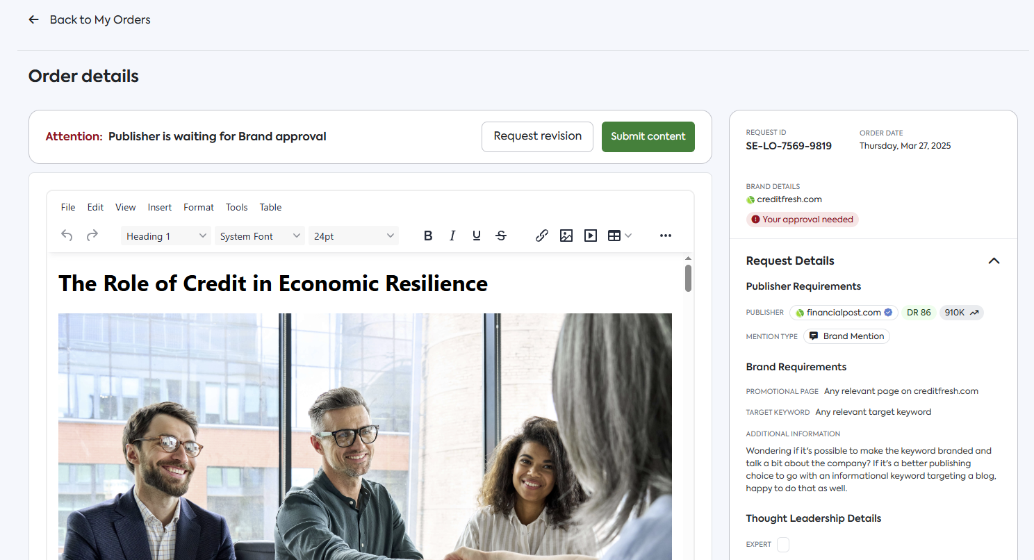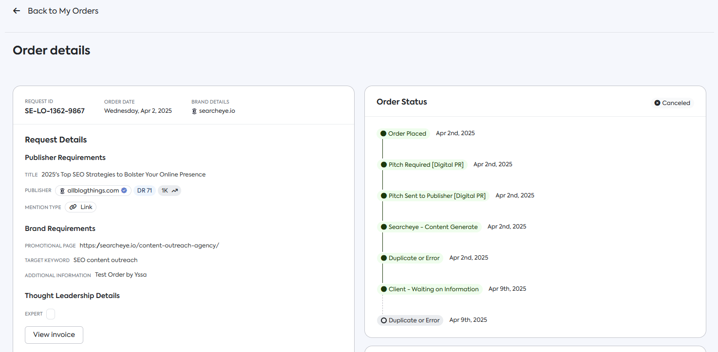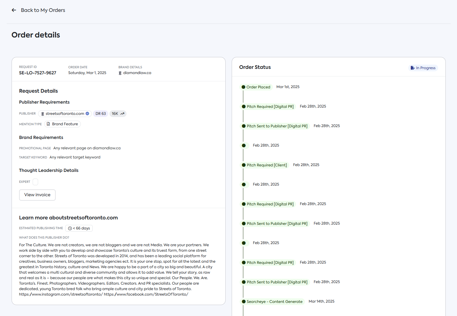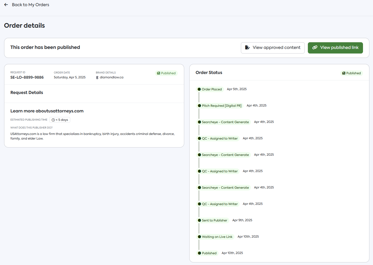You'll be taken to the Order Details page, where you can see both the request summary and detailed status updates.