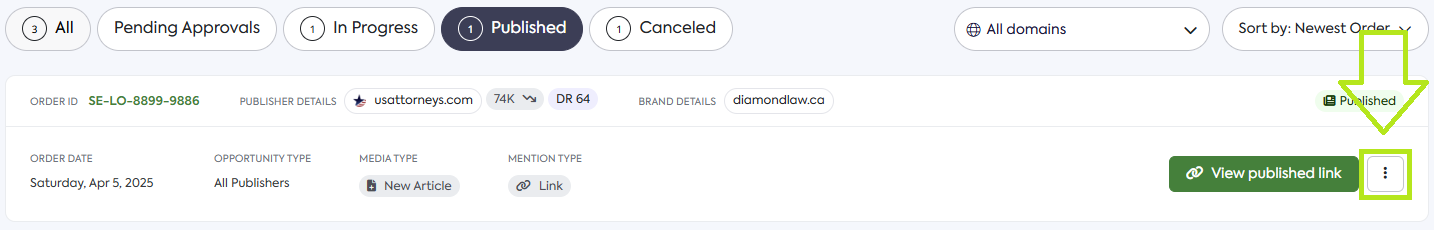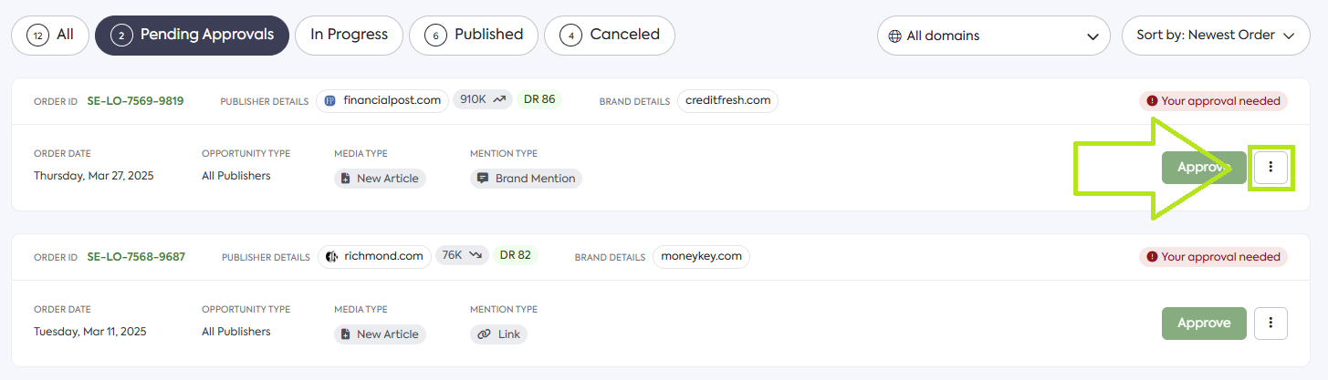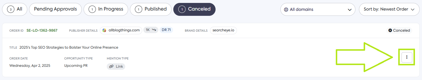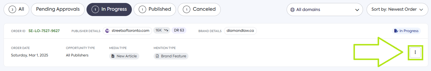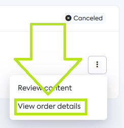 Click the Kebab Menu (three vertical dots) next to the order you wish to manage.