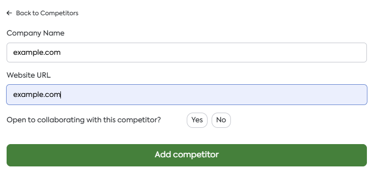 List Your Competitors: Provide the brand names of your key competitors in your market. This includes both direct rivals (offering a similar solution) and indirect rivals (solving the same problem with a different solution).