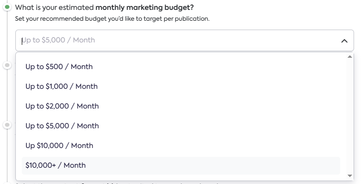 Estimated Monthly Marketing Budget: Set your recommended budget per publication. Options can range from under $500/month to $10,000+/month.