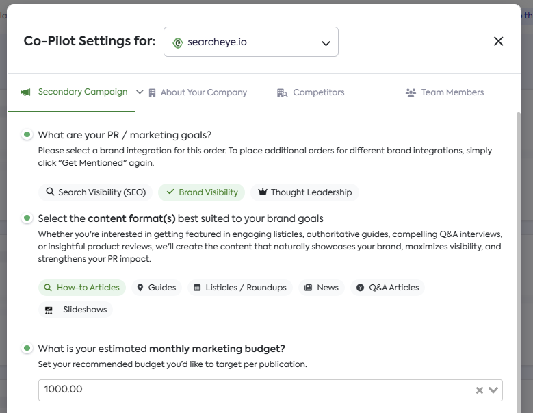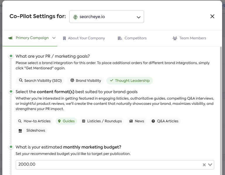 Once selected, PR Co-Pilot will automatically adjust recommendations and settings to align with the chosen domain’s campaign data.