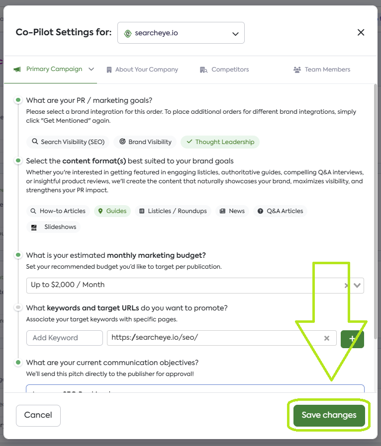 Once you are satisfied with your inputs, click Save Changes to lock in your strategy. You can also refer to our help center article on Understanding SearchEye's Co-Pilot Settings for the complete guide on these settings.