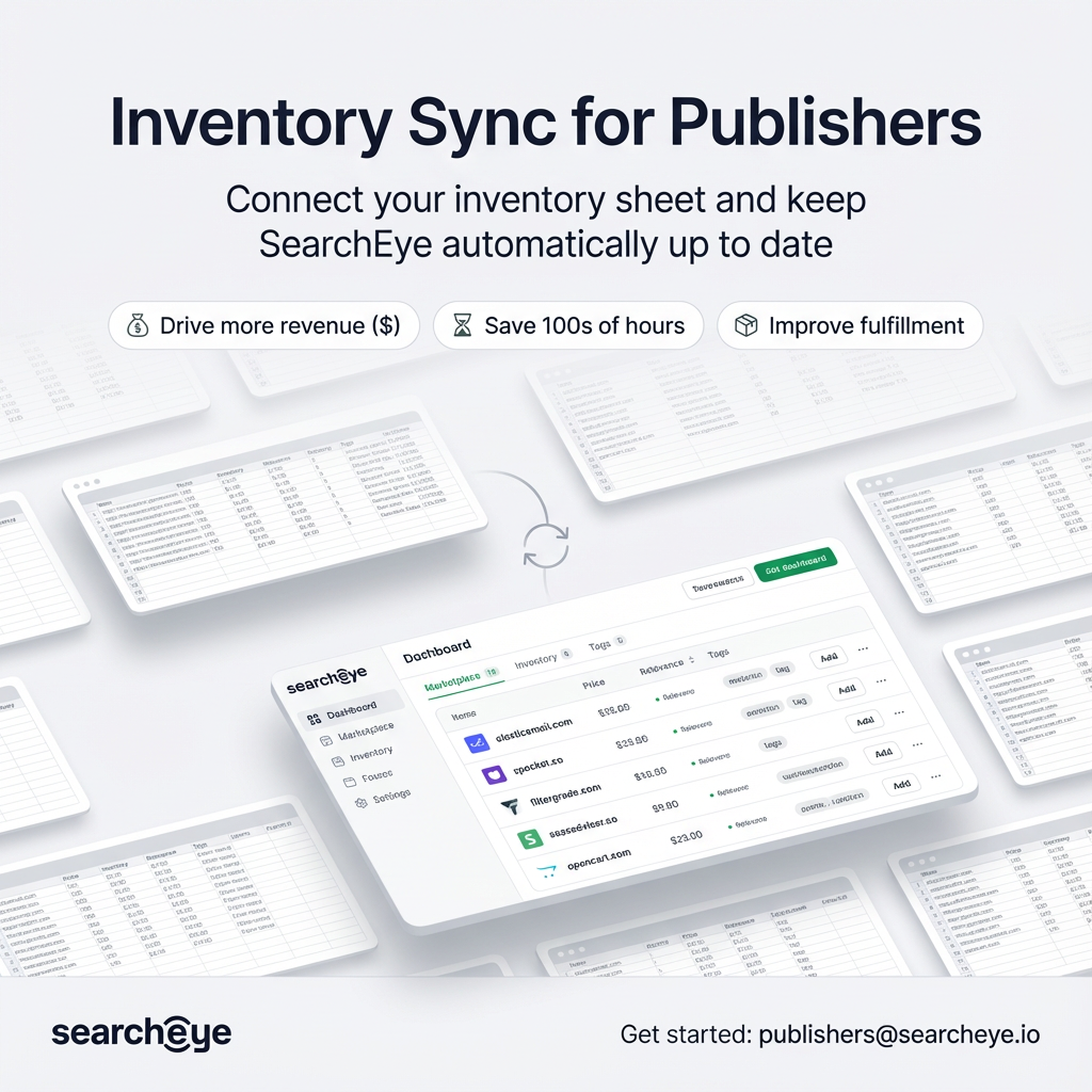 Email publishers@searcheye.io with your Google Sheet inventory link (template or your own sheet) and we’ll get you connected.